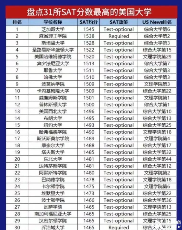 据College Board统计数据,往届新生的SAT均分为1060,但对顶尖大学而言,这个数字则要高出很多。经U.S. News调研统计,以下是新生SAT均分最高的31所大学,快来一起来了解下是哪些学校吧~