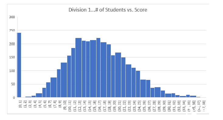 Division1的平均成绩是16.1,大多数学生得分区间为12-13分、16-17分。