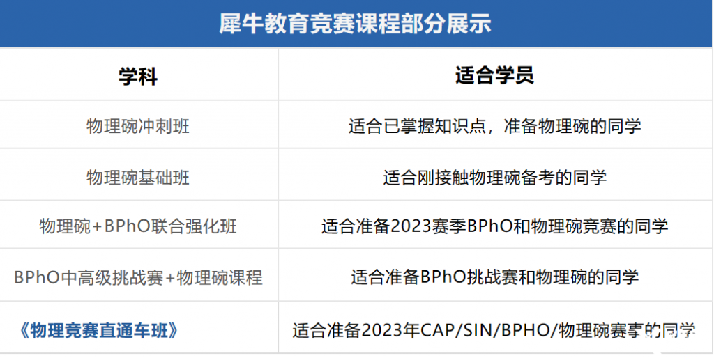 2023年物理竞赛新赛季开启,犀牛物理竞赛直通车寒假开班在即!线上/线下班课皆有。考试只需一场备赛,助力全面拿下4个物理竞赛!