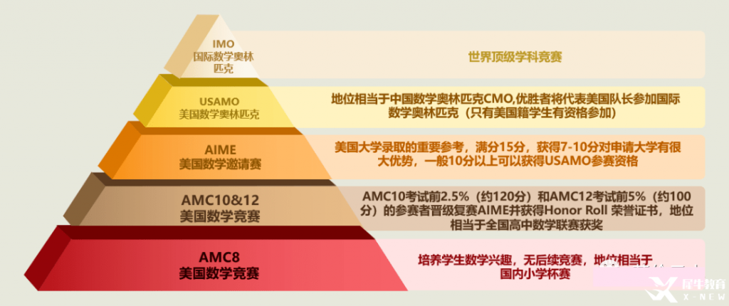 每个级别针对不同年龄段和不同年级的学生。分别是AMC8、AMC10、AMC12、AIME四个等级。总体难度是AIME>AMC12>AMC10>AMC8。