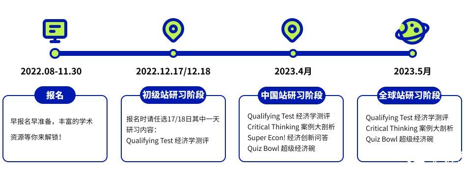中国站比赛时间:2023年3月,考核内容是 Qualifying Test 经济学测评、 Critical Thinking 案例大剖析、 Super Econ 、经济创新挑战、 Quiz Bowl 经济超级碗四项。