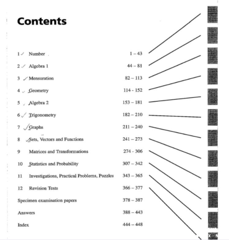 包括了函数、二次函数、方程不等式及图像,指数和根式、多项式、方程组、指数函数及对数函数、直线方程、弧度制、三角函数、排列组合、数列、二维向量、微积分,涵盖的内容只有纯数,不包括概率和统计