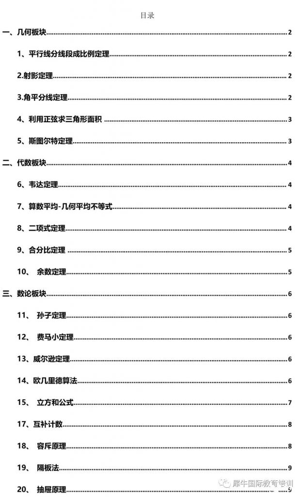 5、排列组合:主要涉及了加乘原理,单循环赛制,排列组合,容斥原理等内容。其中计数原理要了解加法和乘法的区别,加法计数原理的关键词是分类,乘法中的关键词是分步,另外排列组合中要细心,情况要考虑全面,必要时可以简化为考虑其对立情况。主要考查学生分析情景的能力,对于复杂组合问题,必要时可用二项式定理来解决。