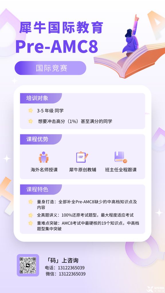 犀牛教育感知到目前不少的三四年级甚至更低年级的学生家长有这样的想法和规划,为大家开设了Pre-AMC8的课程。