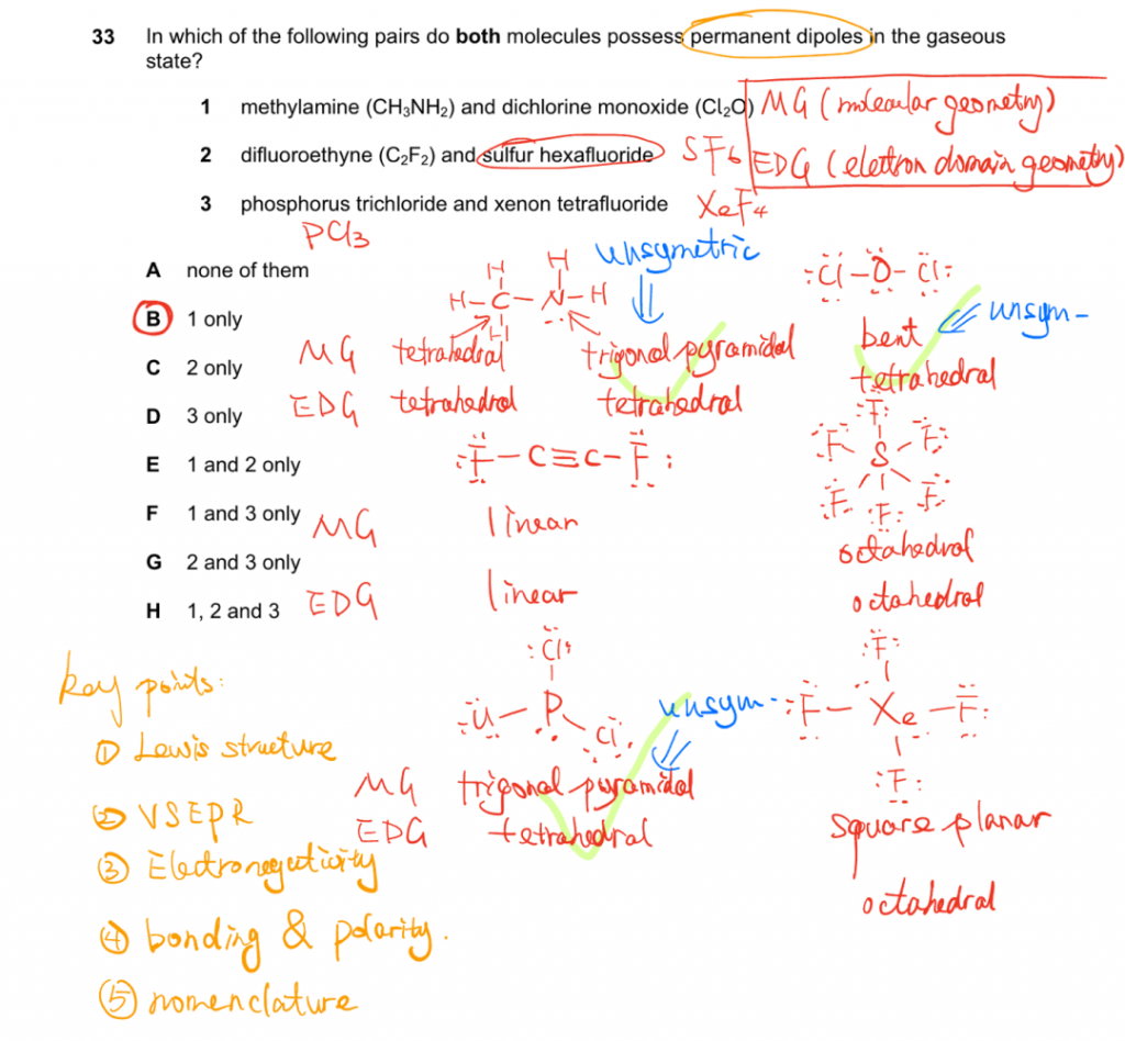 想要快速做对这一题目,同学们需要熟悉Lewis structures 的画法,同时,Nomenclature 必须要过关,否则题目给出名称,无法成功向 Formula 转化,这个题目,肯定无法攻克。此外,从 2022 年开始,VSEPR 部分也成为了 Section 2 的重要考点,所以同学们一定要熟悉题目后列出的表格信息。