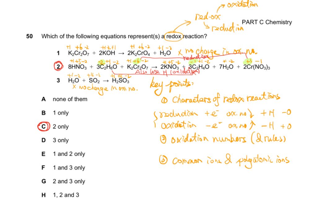 这一题目考察的主要是 Redox reaction 的判定,要求学生对其主要特征要比较熟练,可以快速选出对应的反应方程式,建议在考试中个使用 oxidation number 进行判定。学生在平时应该多进行标注 oxidation number,考试的时候才可以快速做题。另外,对于这个题目中,也可以用 H 的得失,快速判定。由此可见,在高强度的考试中,学生对知识点的熟练度会体现的格外明显。