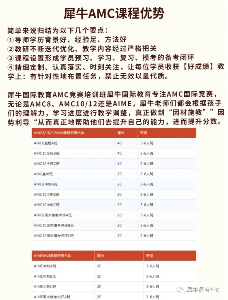 如果你想在AMC等数学竞赛中实现能力突破,斩获更具含金量的奖项,选择犀牛是正确的决定!不论是师资、规划、服务、环境和氛围,的家长们都是好评满满,把孩子交给犀牛很放心~ 高质量暑期班已出,快来抢占席位!