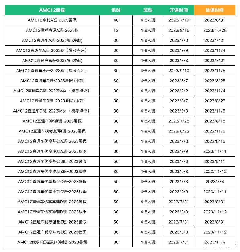 犀牛针对2023年参加AMC考试的同学,2023年直通车课程已开始预约报名!分为A班和B班,A班为周六班,B班为周日班,各自都会分为:AMC8/10/12基础班、AMC8/10/12强化、AMC8/10/12冲刺班,合在一起即为直通车班。扎实基础,轻松拿奖!