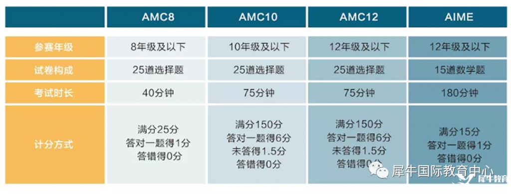 AMC竞赛可分为4个级别,每个级别针对不同年龄段和不同年级的学生,分别是AMC8、AMC10、AMC12、AIME四个等级。