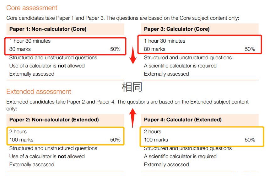IGCSE附加数学和普通数学不同,考试不划分难度等级,仅有两份试题paper 1和2。相比2023/24年考纲,2025年IGCSE附加数学paper 1不再使用计算器,paper 2不变。