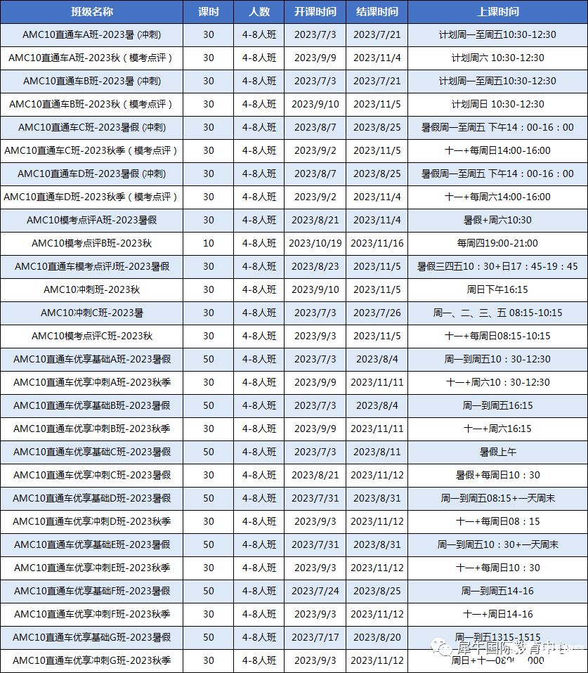 犀牛AMC10/12直通车,针对2023年备战AMC的学生开设,分为A班和B班。A班为周六班,B班为周日班,各自都会分为:AMC10基础班、AMC10强化、AMC10冲刺班,合在一起即为直通车班。扎实基础知识点,轻松拿奖!