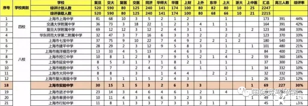 看看高中毕业生的去向,学校高三毕业生200名左右,2019年上实九校综评率为30%,其中复旦30人,交大15人,复医1人,交医5人,如图: