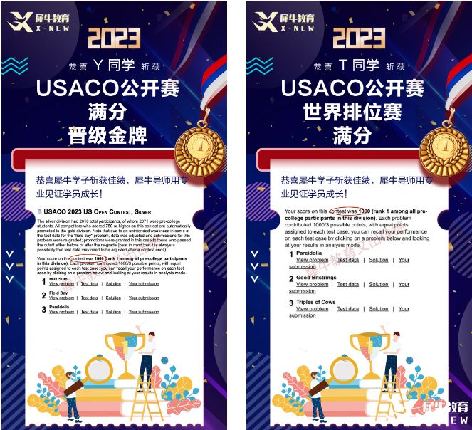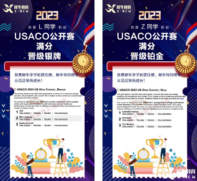 据统计,经犀牛教育辅导的2023 USACO赛季学生,铜升银牌18枚;银升金牌10枚;金升铂金3位,全美前20占据一席。