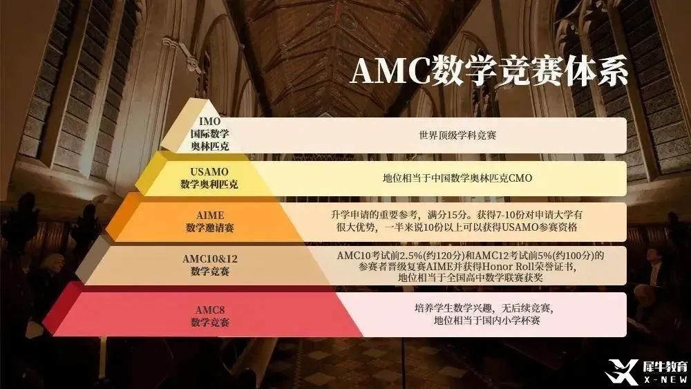 AMC系列数学竞赛有完整晋升体系。AMC竞赛是美国选拔数学奥林匹克选手的第一步,包括了AMC8、AMC10/12、AIME、USAMO\USAJMO,AIME以上限制美国国籍参赛,所以中国学生只能止步于此。