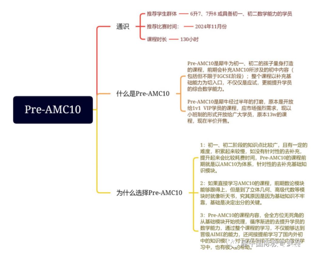 如何衔接AMC8与AMC10?为什么要用Pre AMC10来衔接AMC10?Pre AMC10都学什么?AMC10竞赛不仅考察初中的知识点,也会涉及到部分高中内容,无论是知识点广度还是深度,都比AMC8高得多,对于刚考完AMC8的学生来说,AMC10是个十分艰巨的挑战!犀牛教育Pre AMC10衔接课重磅推出!可直接在线咨询