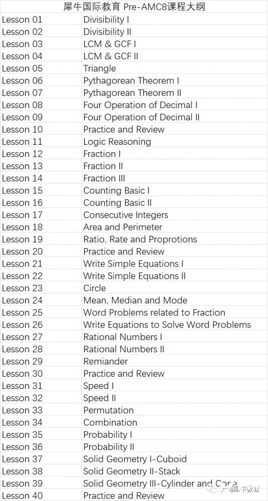 备考初期要掌握AMC8竞赛的基础知识点和高频考点,针对想要上岸三公的3-5年级学生,犀牛专门设置Pre AMC8课程,更能填补3-5年级学生校内知识和三公学校数学笔试中间的缺口,帮助大家能更好地备战三公,打下竞赛基础。