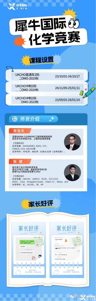 UKCHO将于2024年1月26日考试,想要申请生化方向的同学现在就可以开始准备啦!同时犀牛开设了UKCHO秋季直通车,带大家一起奔向全球金奖!