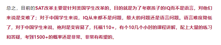 以往SAT纸笔考经常考美国历史、世界名著之类比较难易理解的内容,现在的SAT改革大幅度降低了语言的难度。因此,基本上不太考特别难的美国历史了,小说文章也基本上见不到大咖写的世界名著,整体机考难度降低。