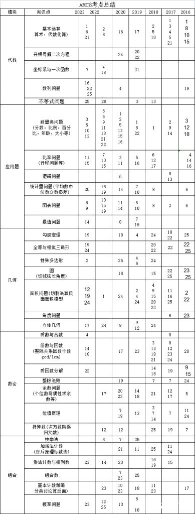 给大家汇总的AMC8的考点分布,同学可以对应看下哪些知识点是已经学过的,如果知识缺口小于一半的话都是建议备考AMC8的~
