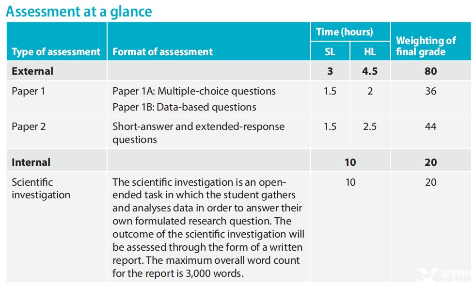 如上所述,除了三张试卷,物理的内部评估(IA)占期末分数的20%。IA由学生进行的实践调查组成,然后由教师进行评估,并由IB进行外部调节。