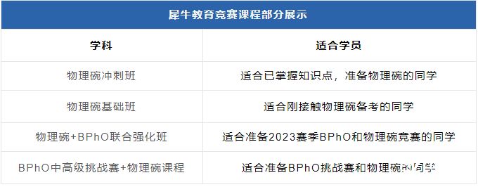 犀牛国际竞赛培训针对备考物理竞赛的学生开设物理碗&BPHO等物理竞赛培训课程,以每2个年级为一个维度,建立了专业的物理竞赛体系,适用所有参加2024年物理碗的同学们。