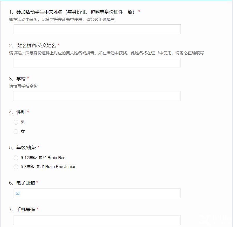 本表单提交后将直接跳转至报名费支付页面。如您还没有决定是否参加活动,请尽量不要提交报名表及缴纳报名费。请前往China Brain Bee 官网仔细阅读并理解参赛说明~