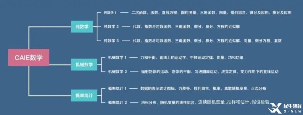 CAIE基础数学主要包含三大部分:纯数(Pure Math)、力学(Mechanics)和统计学(Statistics),各个部分下又分为了不同的单元可供选择。