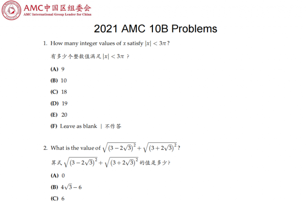 AMC10面向10年级(高一)及以下的同学,AMC10考察内容通常涵盖初三和高一数学课程内容,其难度基本相当于国内初中联赛的水平,主要考察的知识内容也是初中及部分高中数学课内知识以及课外知识,主要包含代数、几何、数论、组合部分内容,难度上比AMC8竞赛更上一层阶梯。