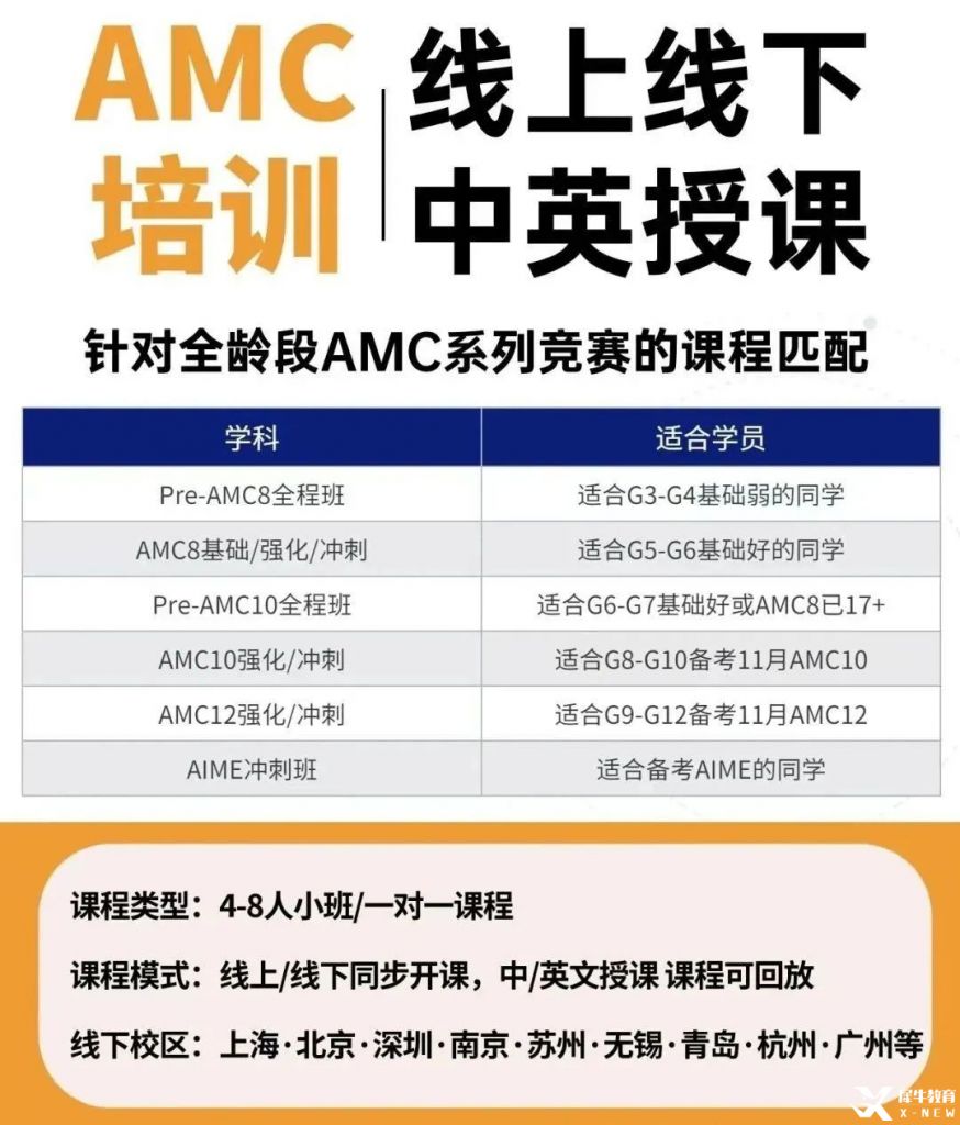 犀牛专注国际竞赛,针对AMC系列竞赛开设Pre-AMC8/10、基础班、冲刺班、直通班模考班。AMC12竞赛培训课程等多个班型,适合不同阶段考生学习提升。