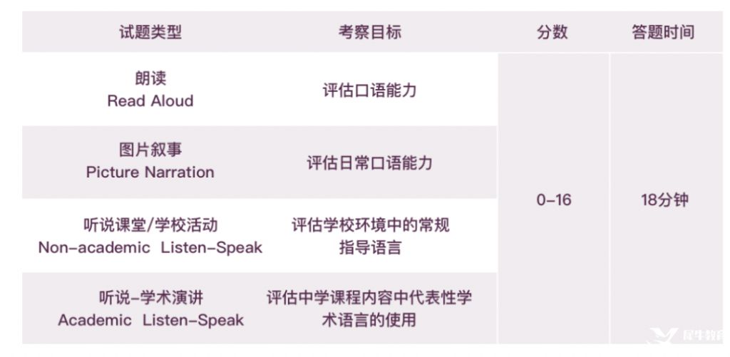口写考试部分,各包含四道题目。每部分分数范围在0-16分之间。考试时长为58分钟。主要测试学生在社交,校园场景及学术背景下的口语和写作表达能力。