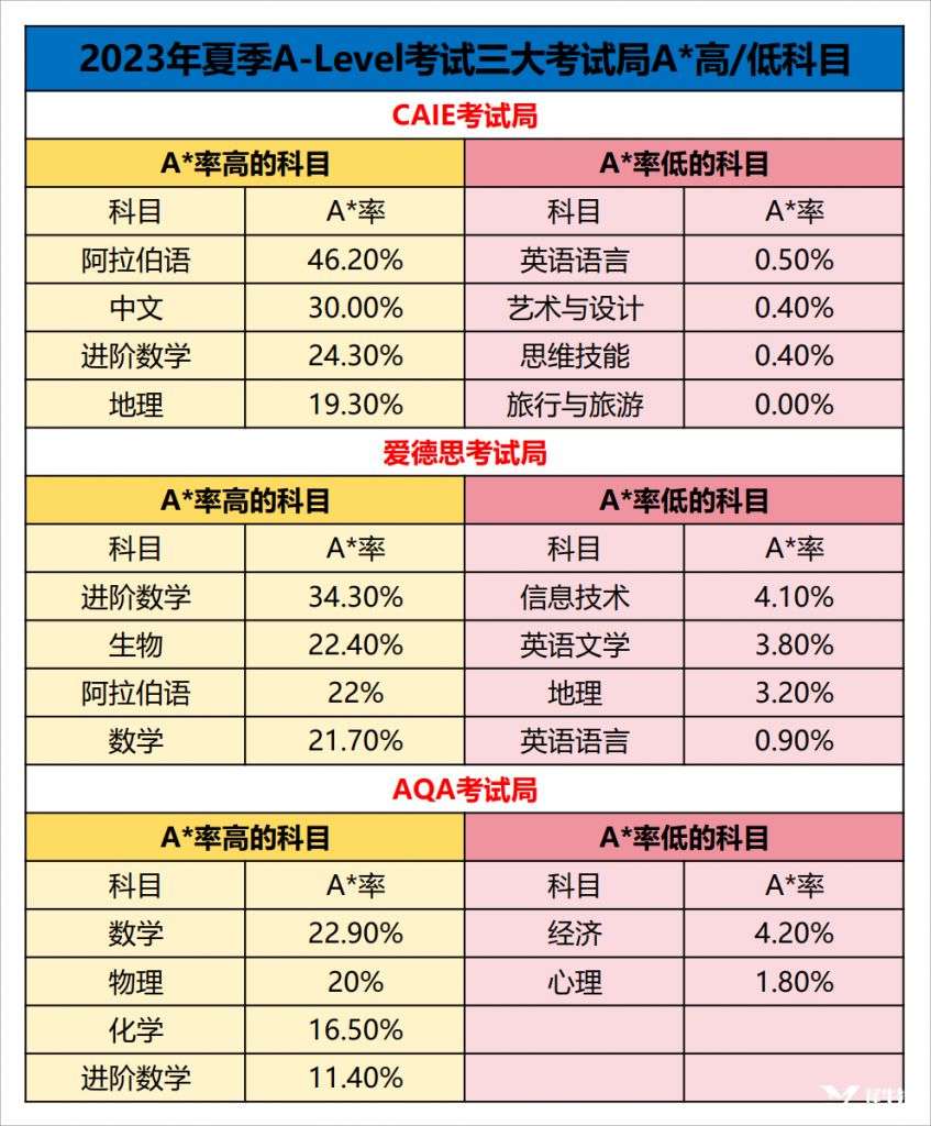 注:给大家汇总的是2023年A-Level夏季大考三大考试局A*率高的科目和A*率低的科目
