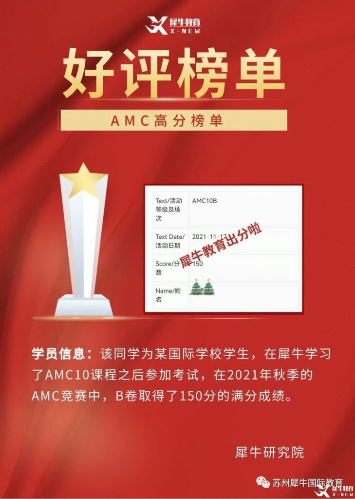 在2022AMC10/12成绩放榜之际,犀牛收到了一大波来自ASDAN的AMC放榜喜讯,在犀牛众多的AMC喜报中,S同学的格外抢眼: