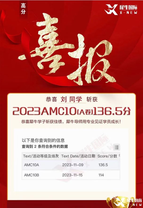 2023年AMC12数学竞赛出分后!犀牛老师收到了一大波来自犀牛学员的AMC高分喜讯!AMC12B卷145.5分,刷新AMC12蕞高分记录....AMC放榜喜报频出~恭喜同学们!