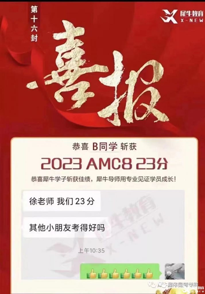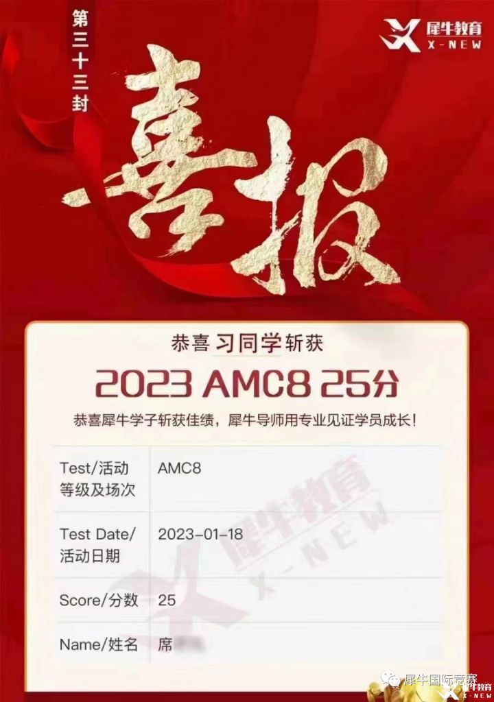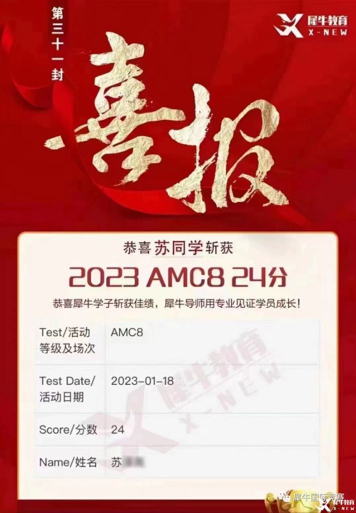 2023年犀牛学员AMC8高分喜报来袭,优秀的竞赛团队带出了AMC8天花板的分数:满分25分。