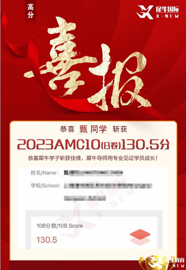 上海犀牛教育每年都会在AMC8/10/12数学竞赛中取得不错的成绩。在去年2023AMC10中有多位学员取得了满分的成绩,这样的好高分成绩离不开上海犀牛教育AMC10培训班课程老师的用心教导,更离不开同学们夜以继日的努力,一分耕耘一分收获,恭喜同学们取得傲人的成绩。