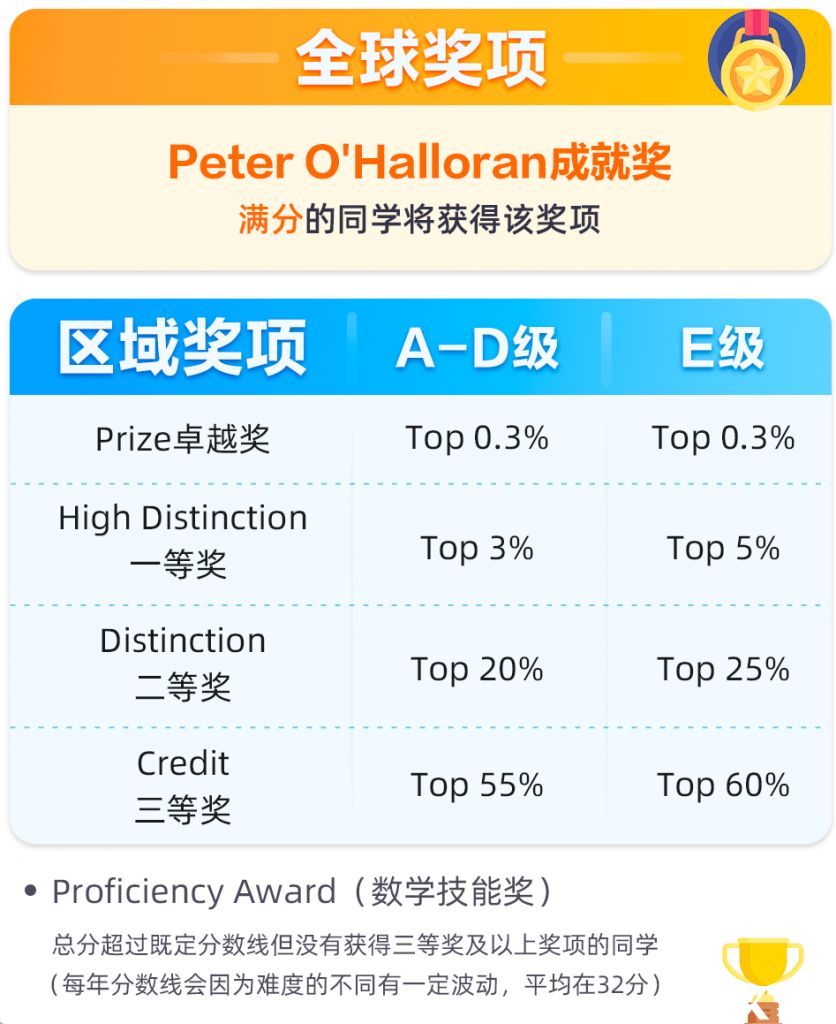 全球奖项设置了Peter O’Halloran Certificate of Excellence成就奖,主要颁发给澳洲AMC竞赛全球满分的同学;