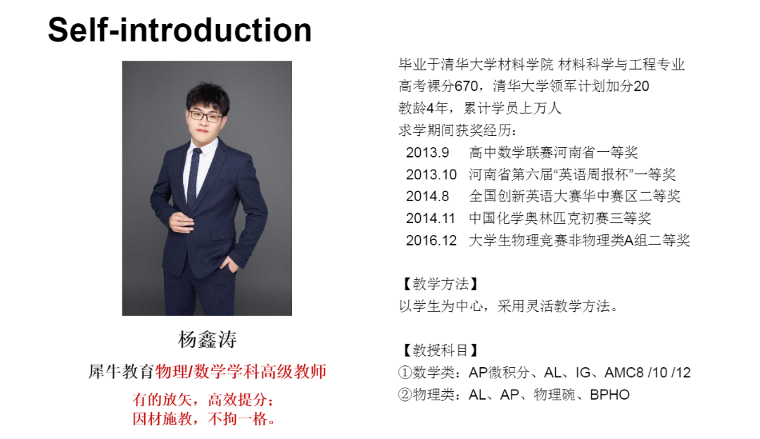 北京大学数学&经济双学位,曾经获得中国数学奥林匹克(全国中学生数学冬令营)CMO银牌,曾担任学校数学竞赛和自主招生讲师,实力和经验不容小觑。