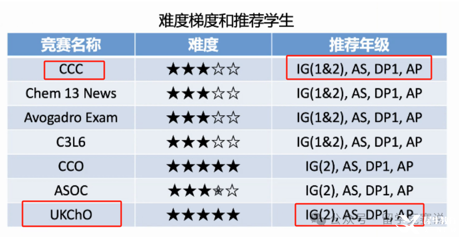 可以看出来UKChO竞赛和CCC竞赛所涉及的化学内容大致是相同的,区别在于UKChO竞赛包含了更多有机化学的考试内容,难度也更高一些。