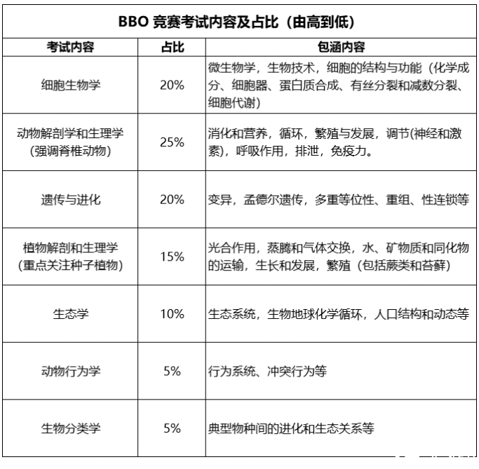 USABO的考察内容基本涵盖AP/IB/A-Level课内生物必修课的大部分知识点,详细分布如下