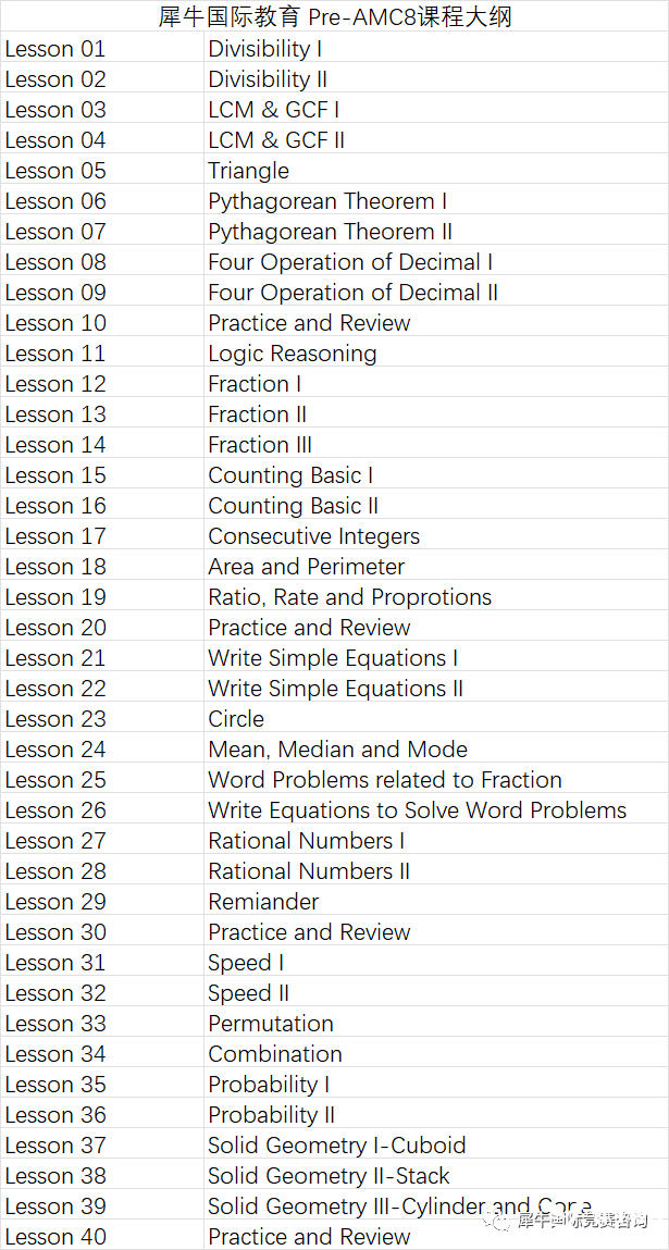 AMC8考试内容涉及部分初中阶段的数学知识点,这对于3-5年级的参赛选手来说还是存在一定的挑战难度!犀牛Pre-AMC8课程为3-5年级孩子助力!