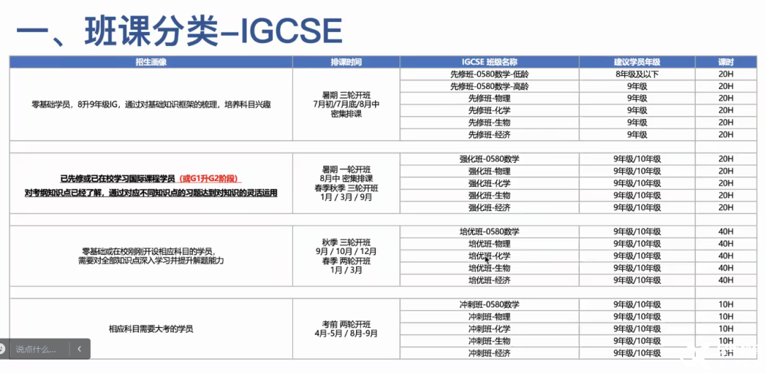 IG课程强化班适合:上了先修的,国际课程在读的,G1升G2的,有基础的,围绕考试大纲的,13(5月大考)9月有课,数物化生经济