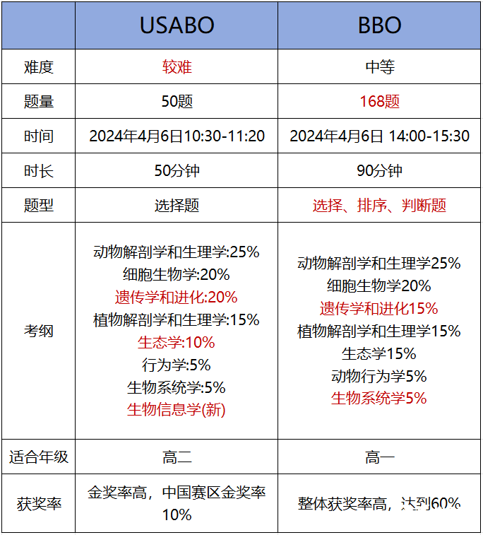BBO和USABO考纲相差不大,并且是同一天的上下午考试,有余力的同学可以同时备考这两个比赛。
