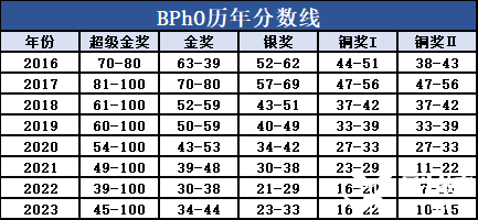 下图是过去8年BPhO获奖分数线趋势对比,2017年分数线达到最高,从2018年开始分数线连年下跌,侧面证明BPhO越来越难。