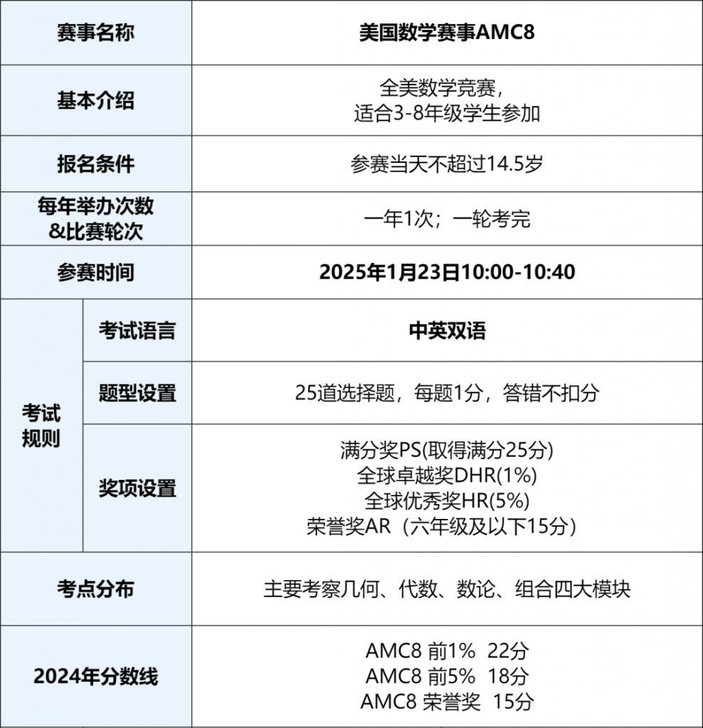 AMC8数学竞赛一年考一次,每年1月开始比赛,2025年AMC8数学竞赛时间也已公布: