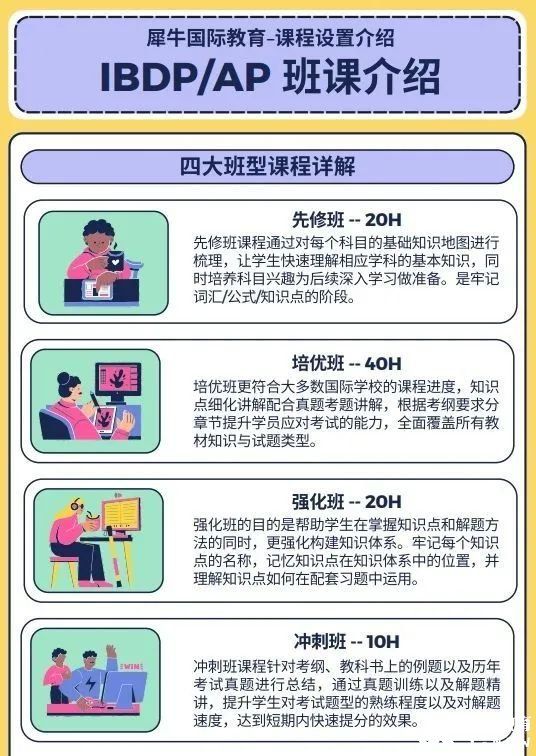 犀牛开设了AP暑期课程,分为AP先修班,AP培优班,AP强化班,AP冲刺班,不同基础和需求的孩子都可以找到合适的课程!