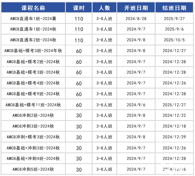 犀牛AMC8课程根据不同的AMC学习基础分班教学,AMC8课程主要是分3个阶段:AMC基础知识巩固、重难点强化、考前冲刺。