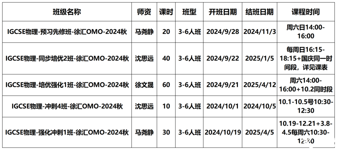 IGCSE物理预习先修班;IGCSE同步培优班;IGCSE培优强化班;IGCSE冲刺班。根据学生情况匹配适合的班级。