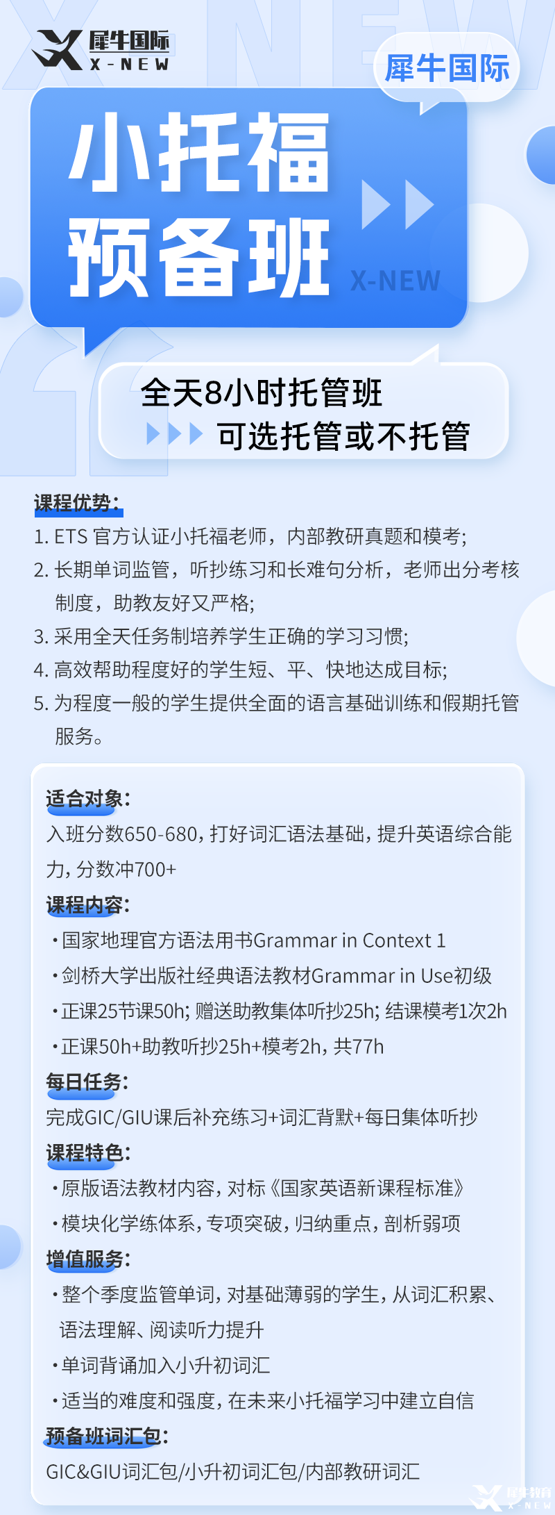 小托福是证明学生英语能力的一个权威途径,那么备考小托福,如何寻找适合的课程,犀牛提供小托福培训辅导课程,多种阶段课程设置,匹配不同基础阶段的学生,为学生提供专业权威的课程辅导,详情欢迎咨询网站客服了解~