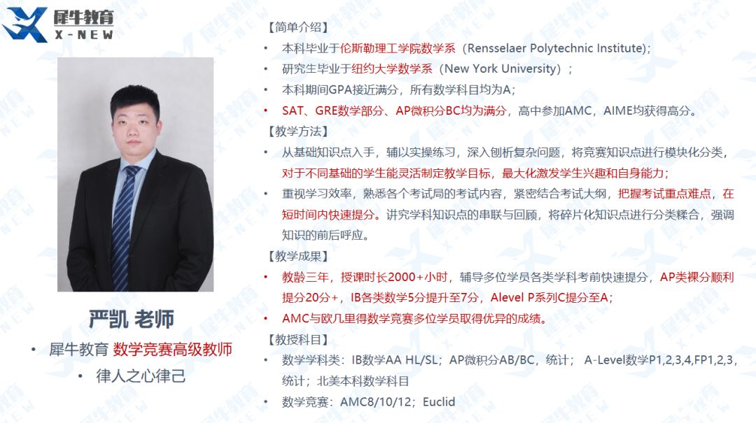 犀牛的老师都是由清北复交、芝加哥大学、纽约哥伦比亚大学、莱斯大学、墨尔本大学等美国TOP30.英国G5的国内外一流大学的博士、硕士背景的老师组成。老师都是海内外名校毕业,竞赛出身师资,从事国际数学竞赛多年,学生时代一路打竞赛,熟悉海内外数竞套路。