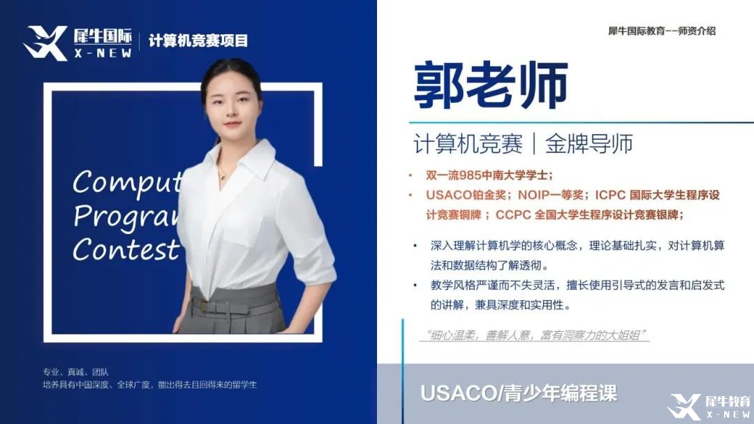 USACO竞赛培训课程首选犀牛国际教育,犀牛教育USACO竞赛培训课程紧密结合USACO竞赛的需求,以USACOguide指导网站上的考点为基准,由经验丰富的专业教师团队精心设计和开发。